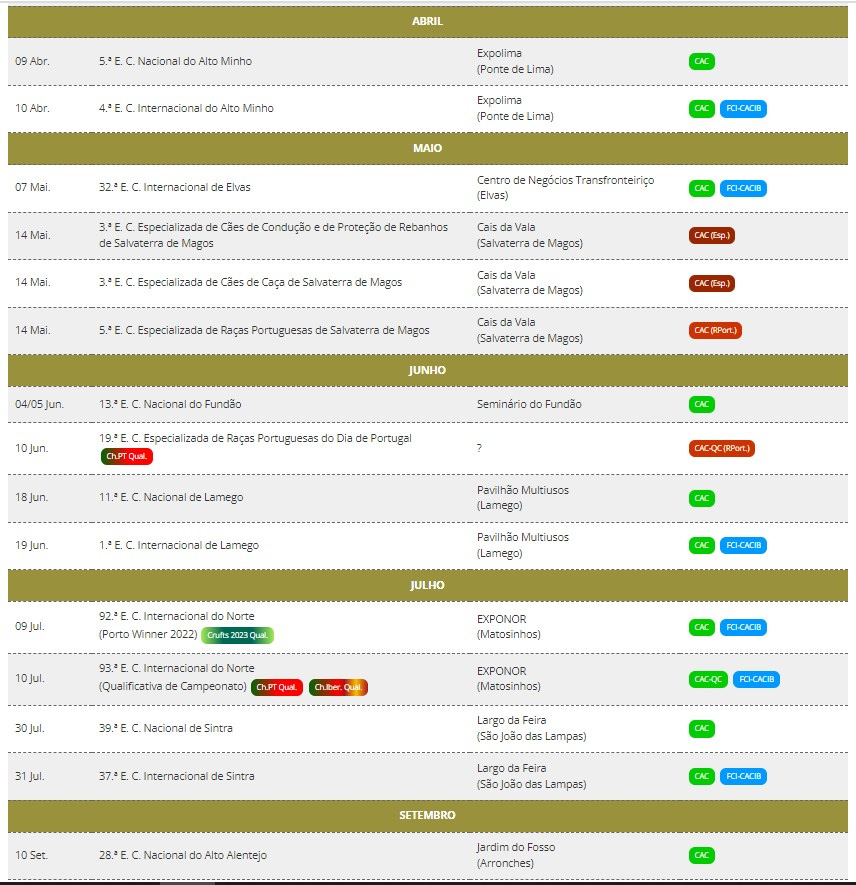 Exposições Caninas de todas as raças (Nacionais e Internacionais) e Especializadas de raças não organizadas por clubes.2022